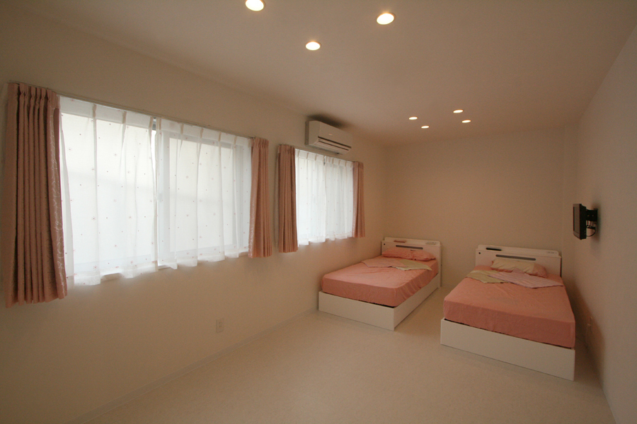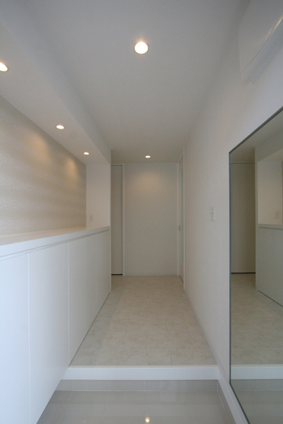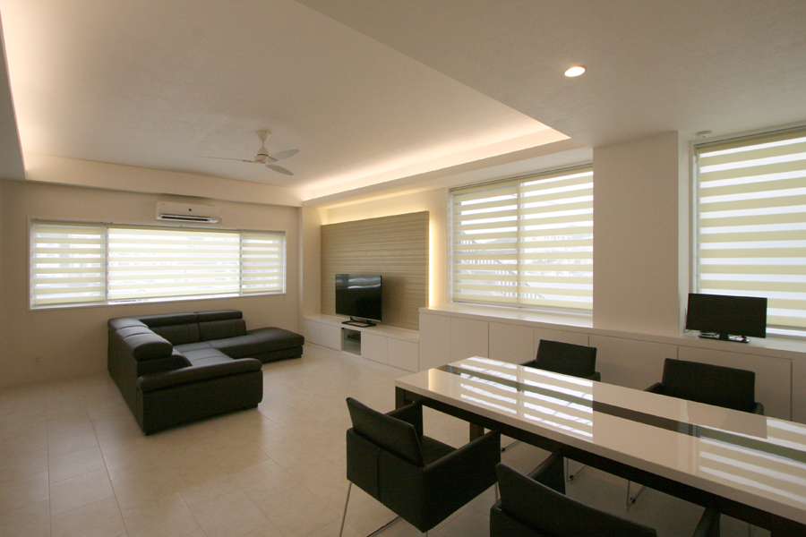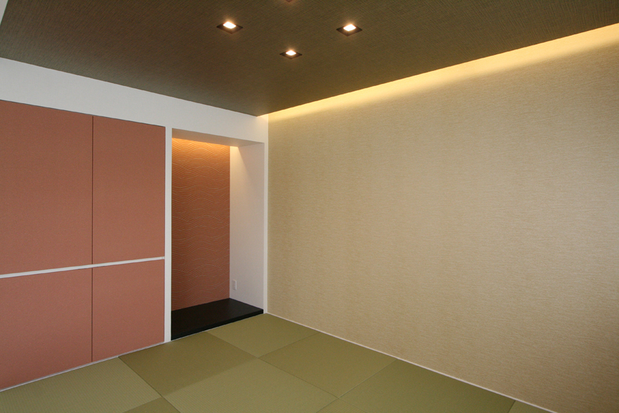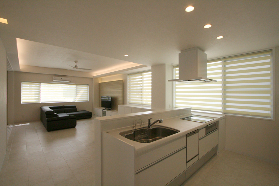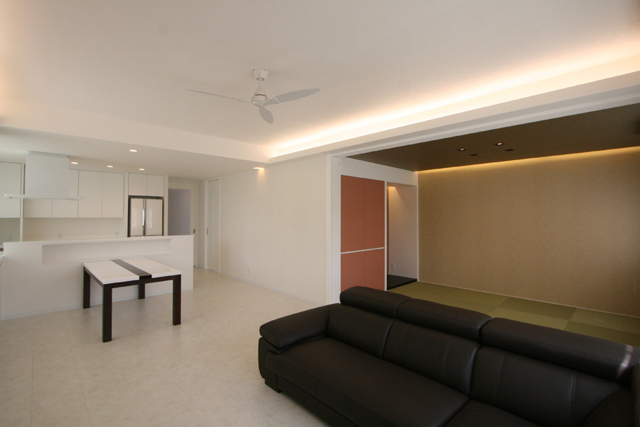 プランは、ライフスタイルに合わせて減築した上で、寝室・子ども室の必要な広さを確保し、明るく広々した21畳のLDKを中心に、約6畳の和室を隣接させ家族が集う大空間へ。浴室・洗面室・トイレなどの水回りは、寝室からも近く生活動線を考慮した場所へ配置。子ども室隣にはクローゼット兼納戸を設け、子ども室から水回りスペースへとも抜ける。インテリアは、白を基調にポイントクロスを合わせ、間接照明の柔らかな明かりで空間の表情をつくり、シンプルモダンな明るい新居が完成した。