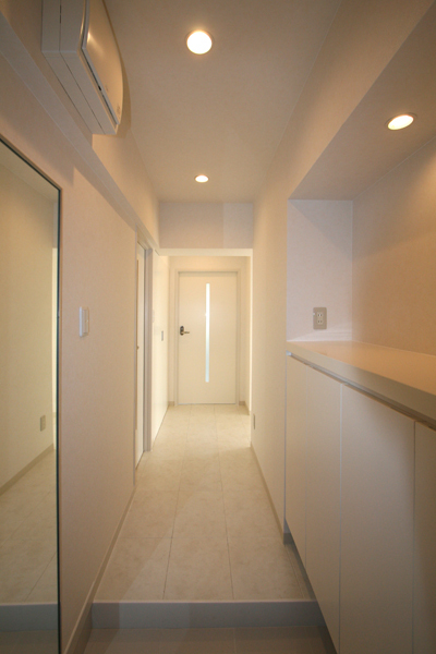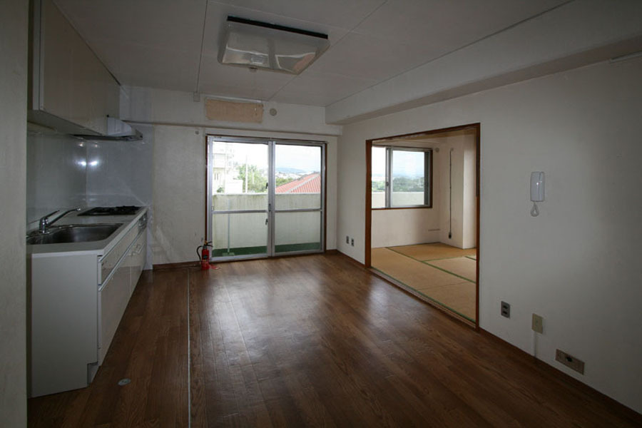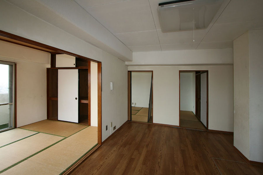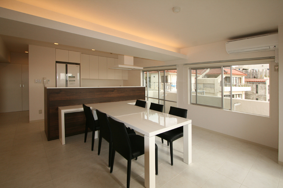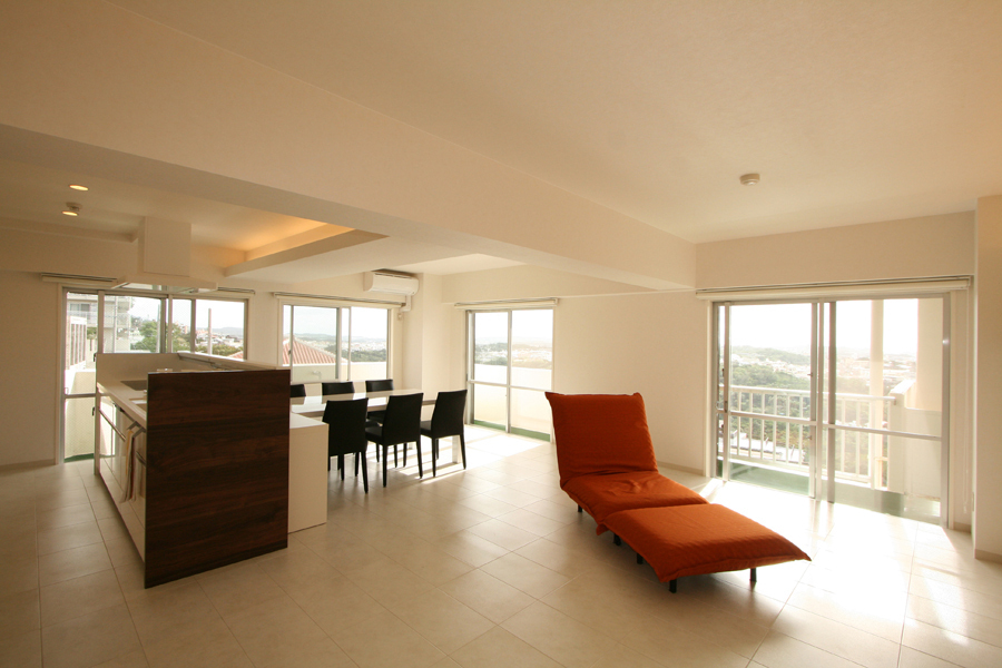 古都の街の高台に建つ築38年の中古マンション。セカンドハウスとして購入し、ご家族の理想の空間へとリノベーション。主なプランは、3LDKの間取りを寝室のみを残し、リビング・ダイニング・キッチンが一体となったワンルームフロアーへ。壁付きだったI型のキッチンは、家事をしながらも景色が楽しめるようアイランド型へ変更し、動線にもゆとりを持たせた。リビング奥にあった和室は、間接照明の入った収納を造り付け、ディスプレイを楽しみながら、ゆったりとくつろげるスペースに。マンションの構造上、天井スラブは低く、太い梁が部屋の真ん中を通っていたり、開口の変更が出来ない等規制がある中で、梁はデザインへと生かし間接照明の柔らかな光で圧迫感をなくし、全体を白色で統一することで明るさと開放感を演出。シンプルながらにも、贅沢なホテルライクな空間が生まれました。