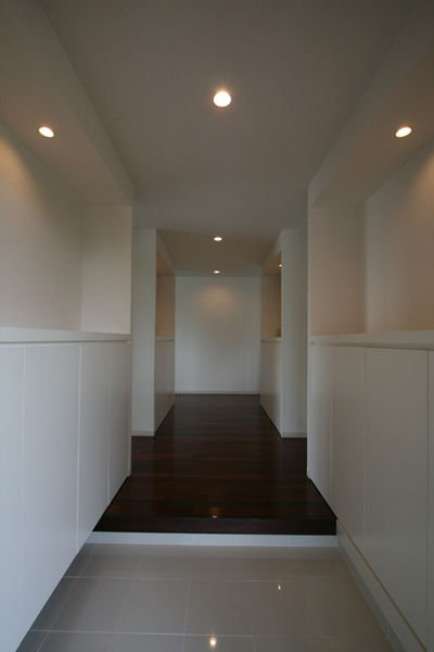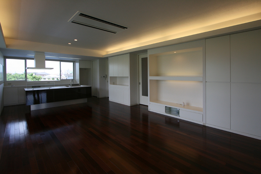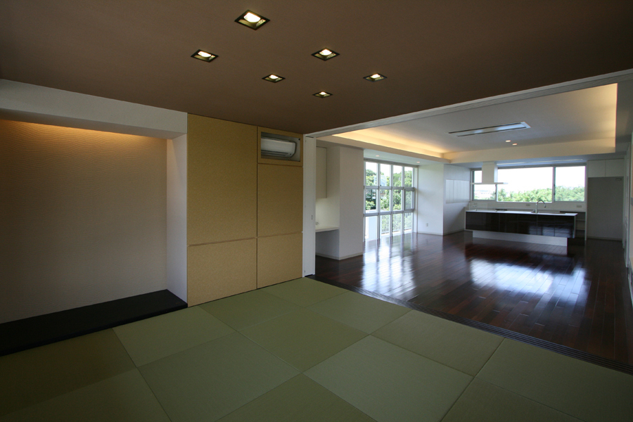 主なプランは、和室・リビング・ダイニング・キッチンが一体となった明るく広々とした空間にする事と、隣接する2室の子ども室をワンルームにし仲間が集い趣味を楽しむ多目的ルームにする事がポイントとなった。まず玄関ホールに、趣味で描いた絵画や収集した作品を飾る収納を兼ねたギャラリースペースを設け、ホールから右側に多目的スペース、左側にプライベート空間となるLDKを配置した。LDKはリビング横にあった和室と応接間を撤去し縦方向に広がりのある空間へ。利用が少なかった掃出し窓は、デザイン的な格子型はめ込み窓へ変更し、外とのつながりを感じさせながら明るさも確保。キッチンは対面型へ変更することで作業動線と収納を充実させた。また、和室は戸袋に収めた戸を閉めると完全な個室ともなる。それから寝室は、生活スタイルの変化により和室から洋室へと変更し、間接照明の優しい灯りでくつろぎの空間とした。多目的ルームは、造り付収納デスクや家具でスッキリさせ、新設したデッキテラスでより広がりのある集いの空間となった。また、ワンルームとしながらも戸を閉めることで2室となり、独立している子ども家族が来た時には個室として使用できるようにした。全体に基調色を白色とし、濃茶のフローリングと間接照明の演出でモダンで落着きのある空間が生まれた。