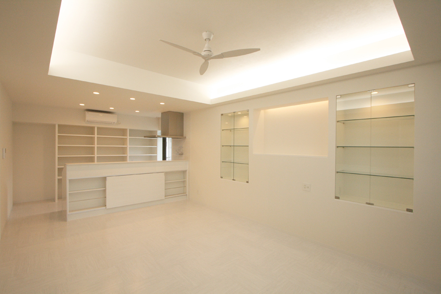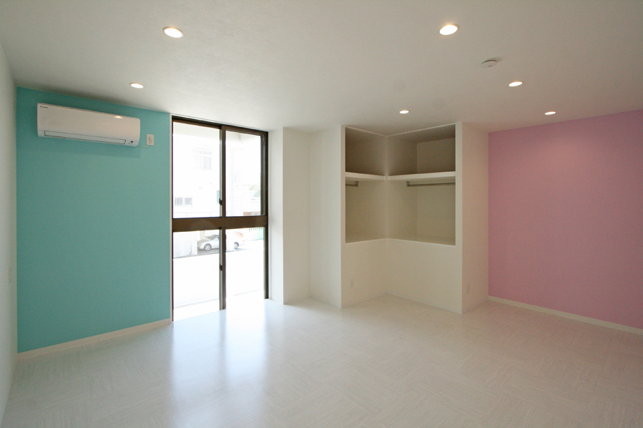 こちらは、2階部の子世帯のスペース。主なプランは、新たに玄関ホールと、システムキッチンやシャワールームの水回りの設置。また家族が集うリビングを中心に、寝室と子ども室を配置し、明るい空間へとリノベーションすることに。そこで、既存の間取りは全て撤去し、玄関ホールから右側はパブリックスペースのLDK、左側は寝室や子供室、浴室などプライベートスペースとした。リビングには収納を充実させ、天井もスラブまで上げ高さを確保。テラスは、花ブロックのパーテーションで近隣からの視線を考慮しながら、室内側からも開放感のある空間へ。子ども室は、一階部からの内階段と吹き抜け部分に床を張り、広々としたワンルームのフレキシブルな空間とした。インテリアは、奥様の好みを採用。全体の基調色を白としながらも、各部屋ご家族それそれ好みのクロスをポイントに選択し、インテリアも楽しんでいます。