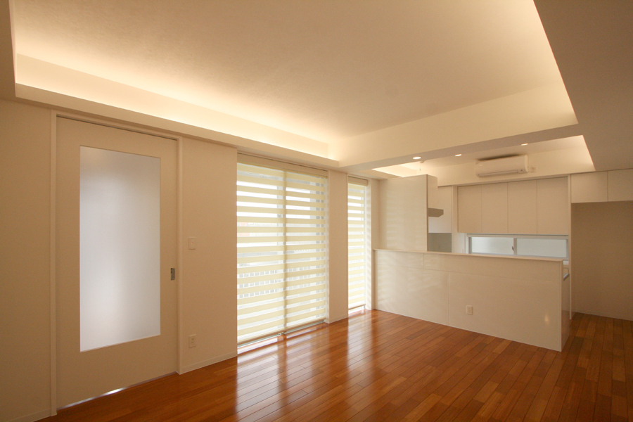 主なプランとして1階部は、個室になっていた台所・食卓とリビングの間仕切り壁を取り除き、ワンルームの広々としたLDKへ。キッチンは壁付けのI型から対面式へ変更。また、床の間の和室は、洋室へと変更しウォークインクロゼットを備えた主寝室とした。2階部は、多目的広場と2室の個室を、子供の成長を見据えて、3室の洋室へと変更した。室内インテリアは、全体的に白色を基調色とし、柔らかな間接照明効果で、明るく心地良い空間へ。外回りは、植木のあった庭は撤去し、コンクリートのテラスとして、子供たちの遊び場やバーベキューなどが楽しめるスペースとなり、家族のつどいの場とした。