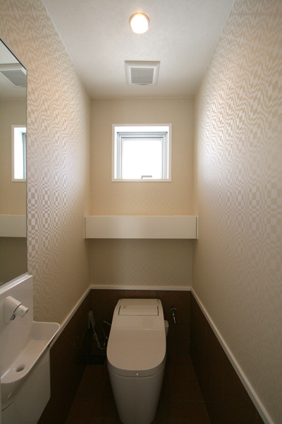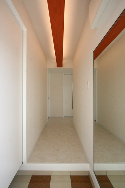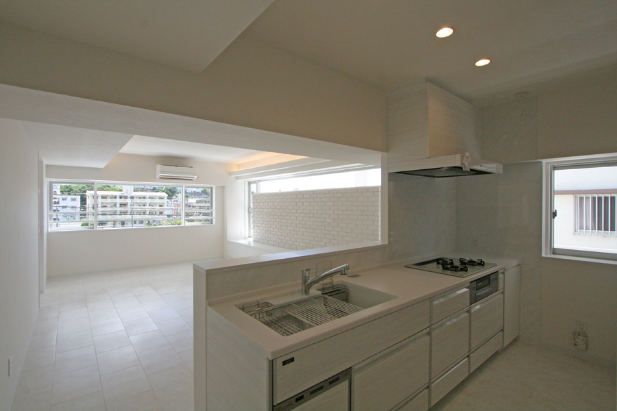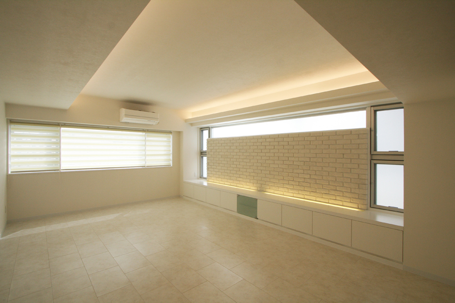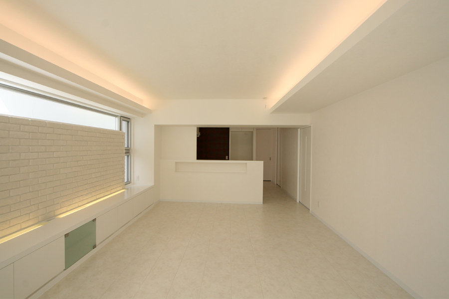 賃貸スペース境は、南北に大梁があり梁下2mと天井も低く、構造上抜くことのできない梁も多かった。そこで圧迫感とスペースの無駄をなくすため、対面キッチンや寝室クローゼット出入口のさがり壁のデザインとして活かしながら、天井に高低の変化をつけ間接照明を設置。インテリアは、白を基調に赤や緑のビビットカラーのアクセントクロスを。テレビ収納台は低めにデザインし、雰囲気のあるレンガタイルでモダンな空間へ。間接照明のやわらかなあかりと、外へ視線が抜ける窓からのひかりが、コンパクトながらも明るく開放的な空間に仕上がった。
